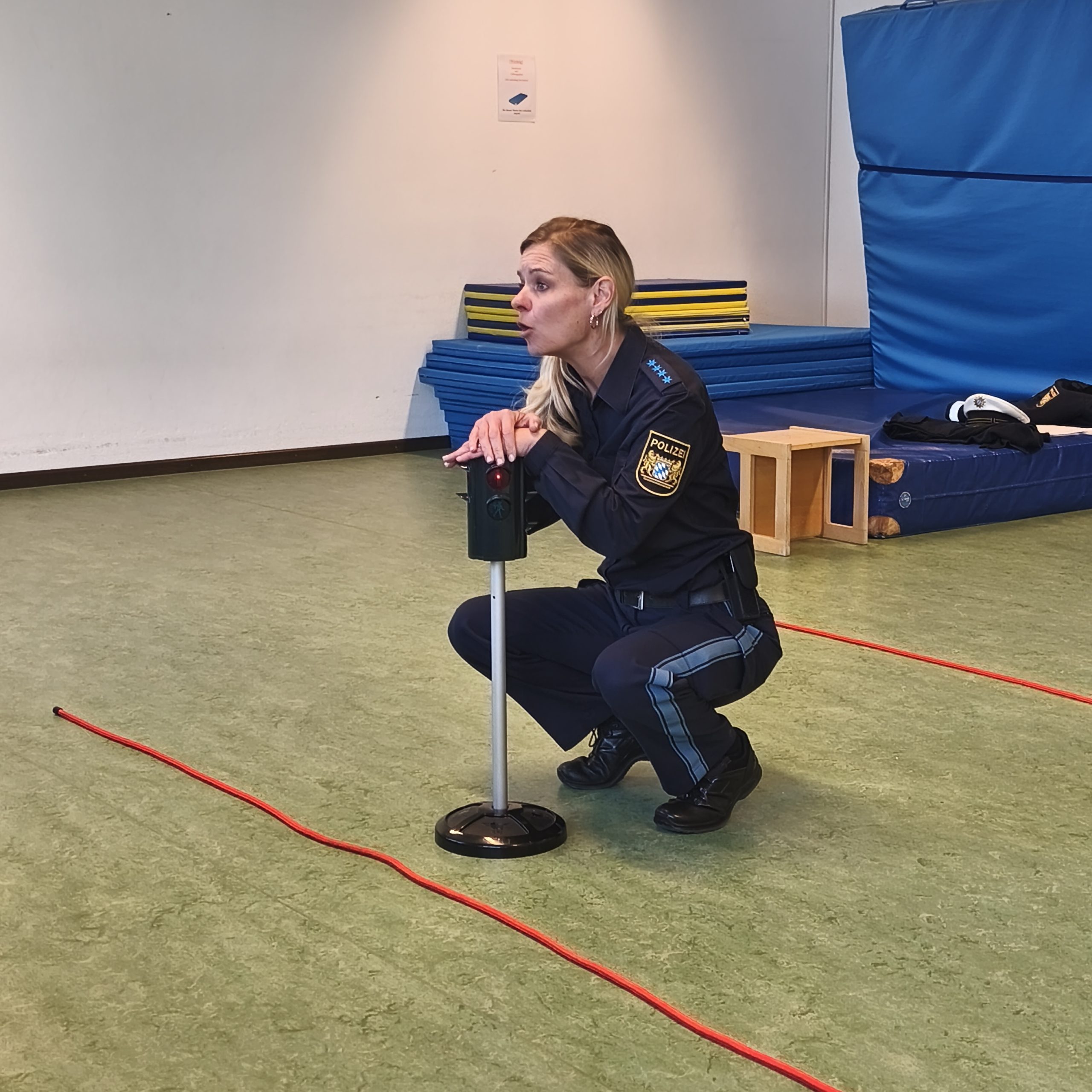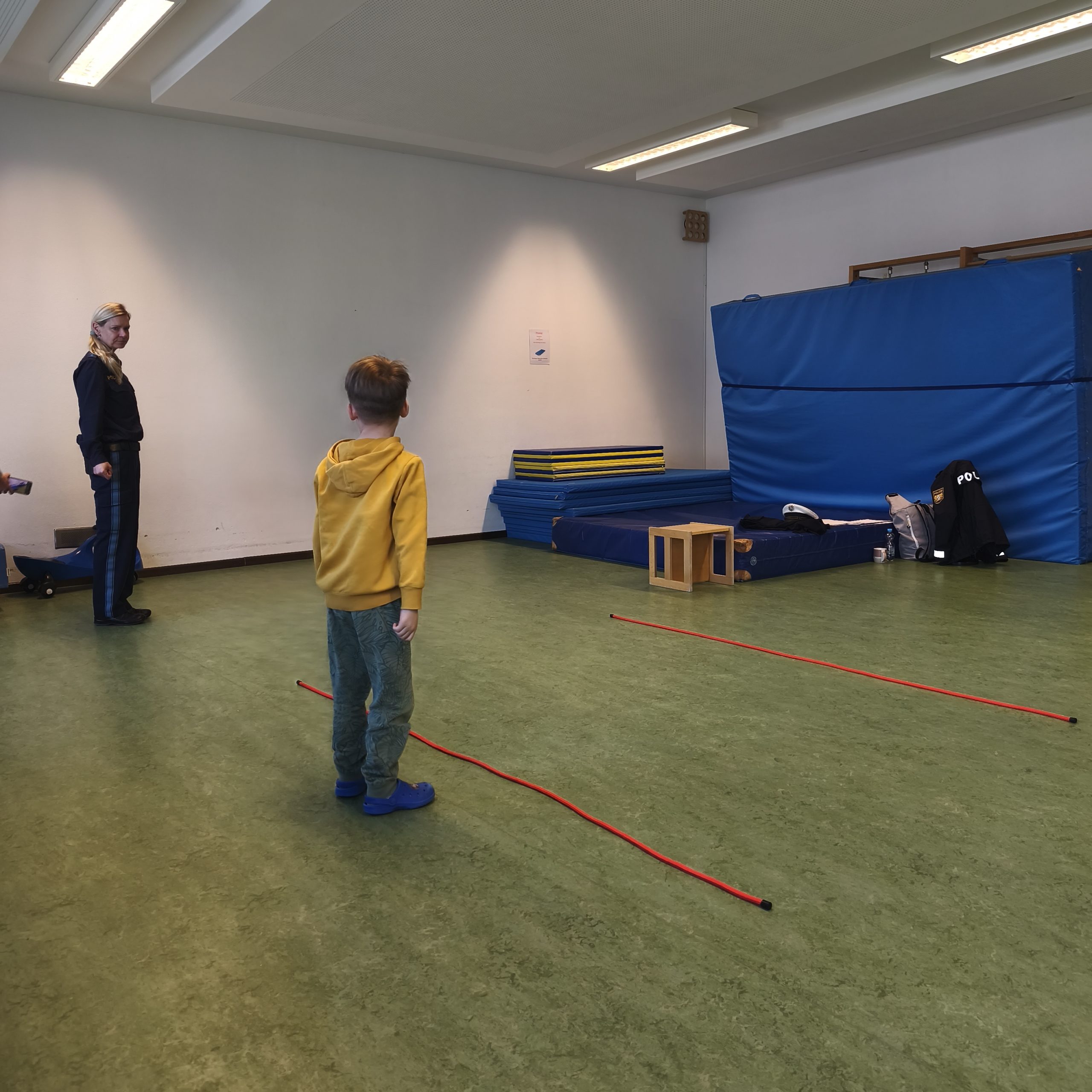 Zunächst wurden theoretische Inhalte der Verkehrserziehung mit den Vorschulkindern im Turnraum besprochen und eingeübt, z. B. „wie gehe ich sicher über die Straße“.