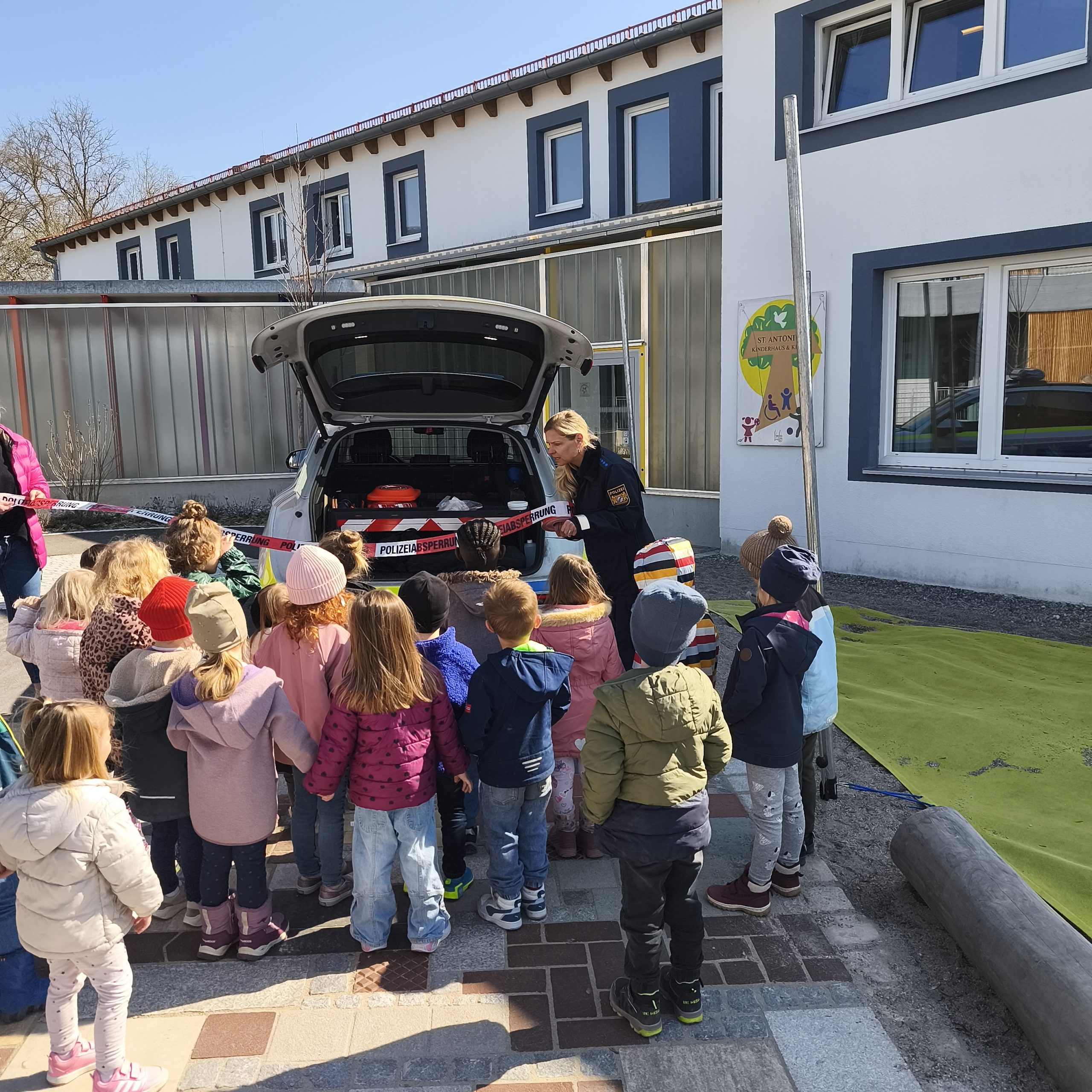 Ein absolutes Highlight war natürlich für alle Kinder vom Kinderhaus St. Antonius das Polizeiauto aus nächster Nähe zu betrachten. Zum Abschluss hat die Polizistin das Blaulicht und das Martinshorn angeschaltet. Die Kinder waren hellauf begeistert und strahlten über das ganze Gesicht.